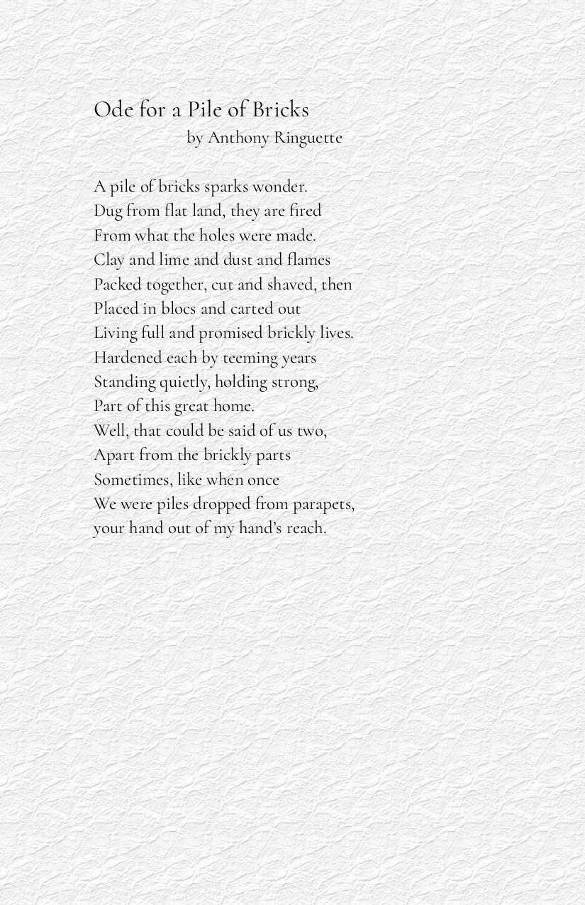 Dark Souls, essentially. There are so many assets in the game, like stray piles of bricks, that tell their own story and I wanted to do something with that impulse in a poem.