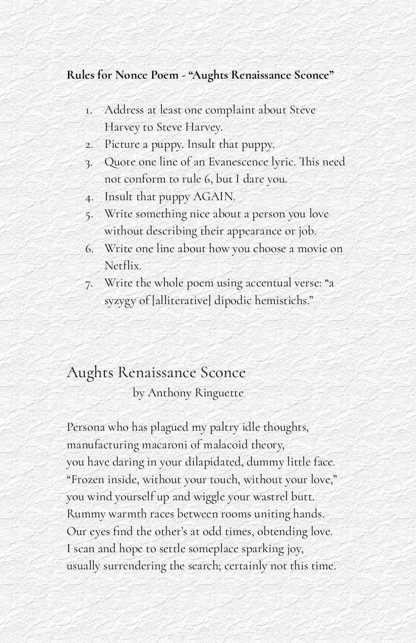 A sconce poem! You should try to make a poem with my dumb little rules and see what happens.